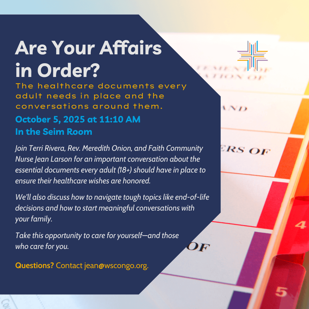 - October 5 – Are Your Affairs in Order? With Jean, Meredith, & Terri R. | Location: Seim Room