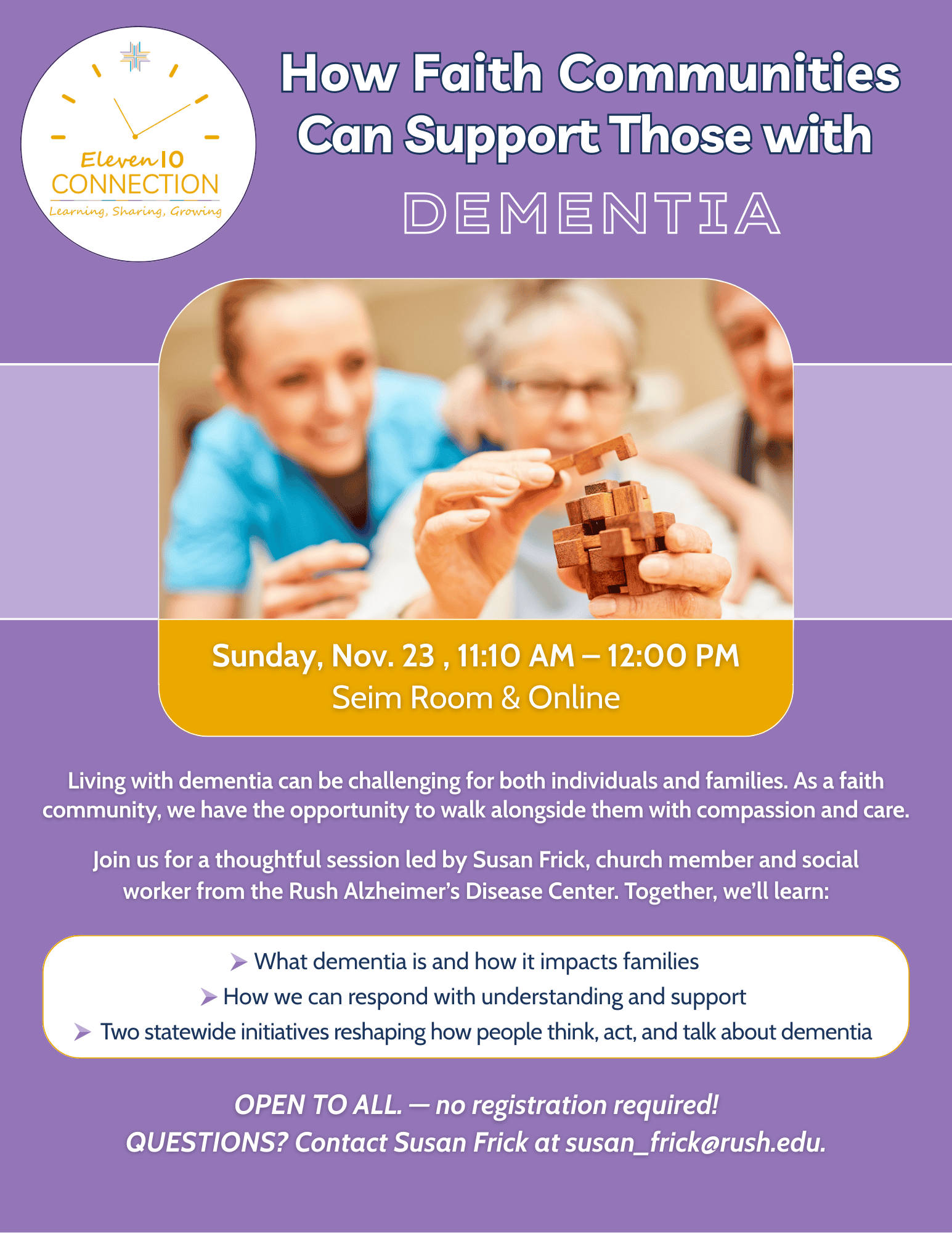 Susan Frick, a church member and social worker from the Rush Alzheimer’s Disease Center, will inform us on how we can support people with Dementia.