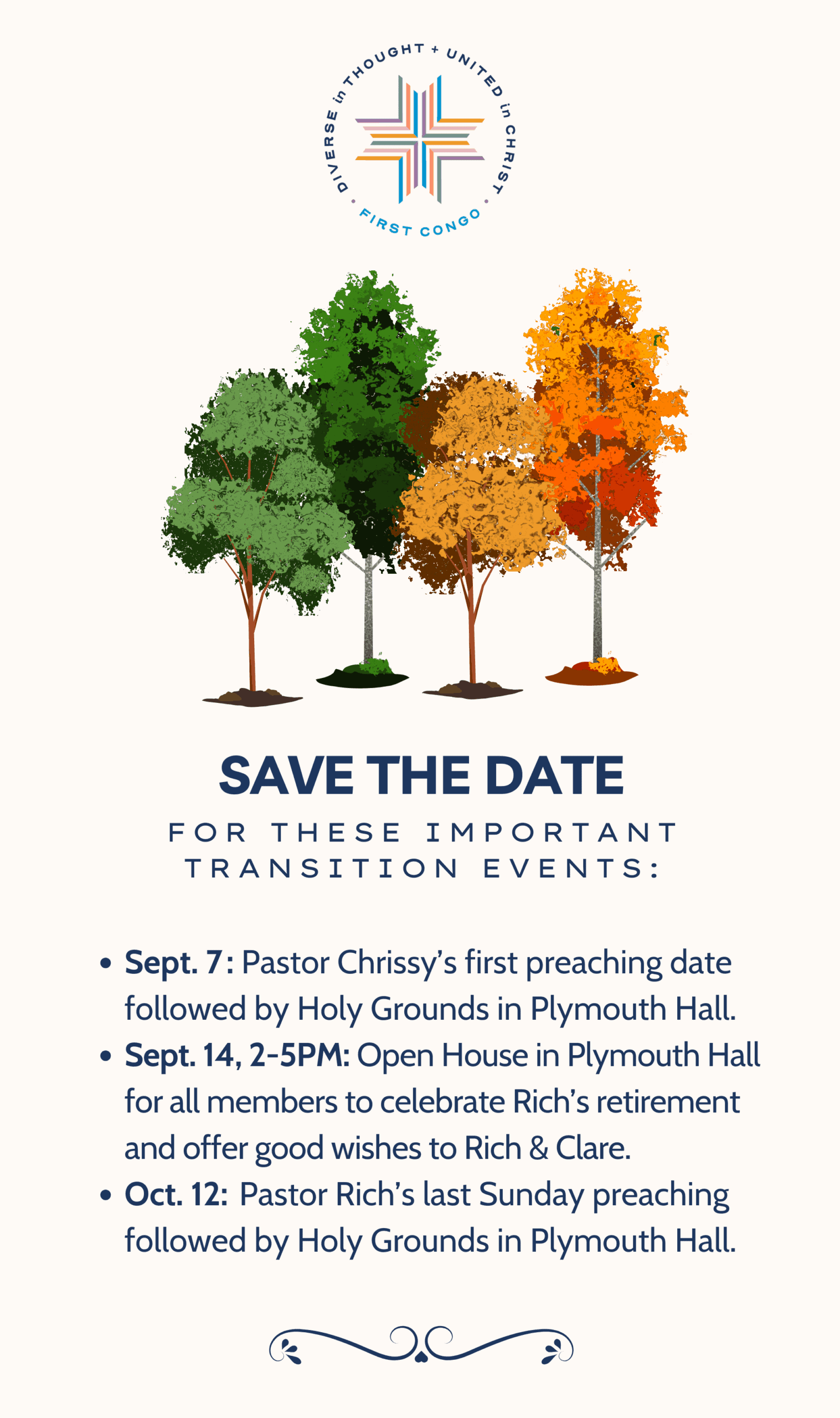 - September 7 – Robust Holy Grounds for Chrissy’s First Sunday Hosted by the Search Committee | Location: Outside or Plymouth Hall