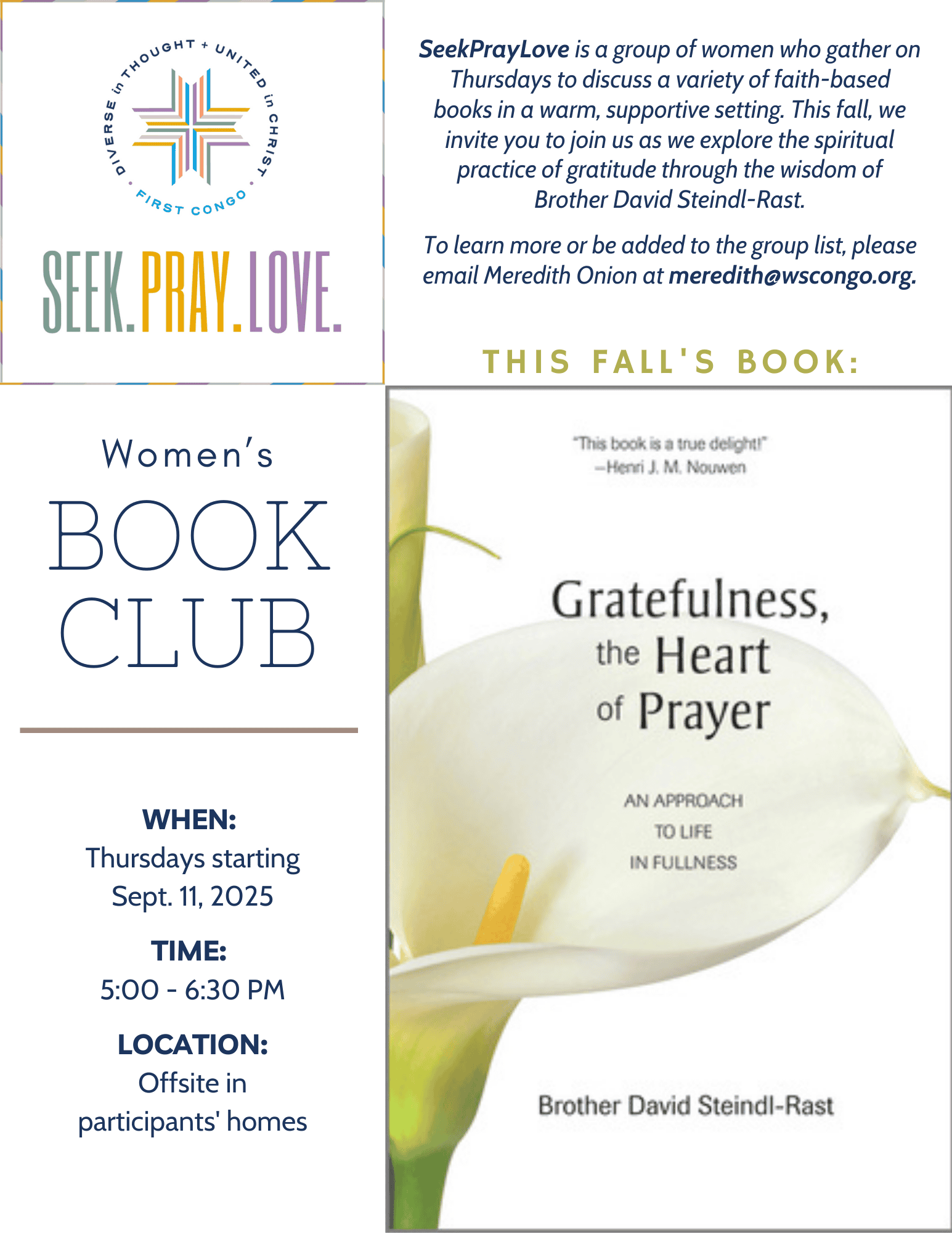 Join this Lectio Divina group who will gather via Zoom to read scripture and reflect on what words or phrases stir their hearts. Reach out to Meredith Onion to get connected to this group at meredith@wscongo.org.
