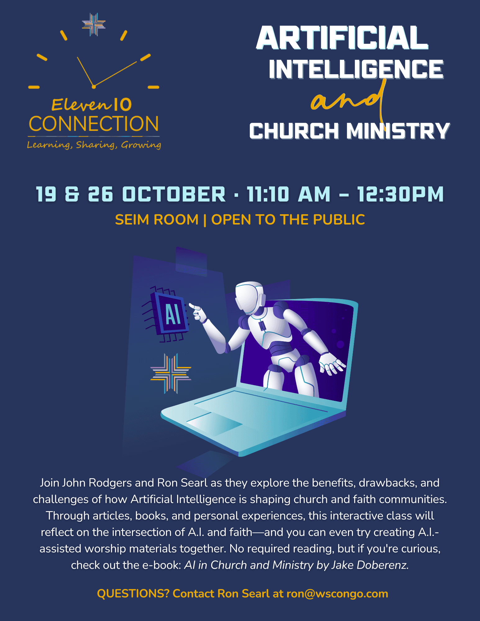 - October 19 – AI and Church Ministry (Part 1) Exploring benefits, drawbacks, and creative uses of AI in faith & worship With John Rodgers & Ron Searl | Location: Seim Room