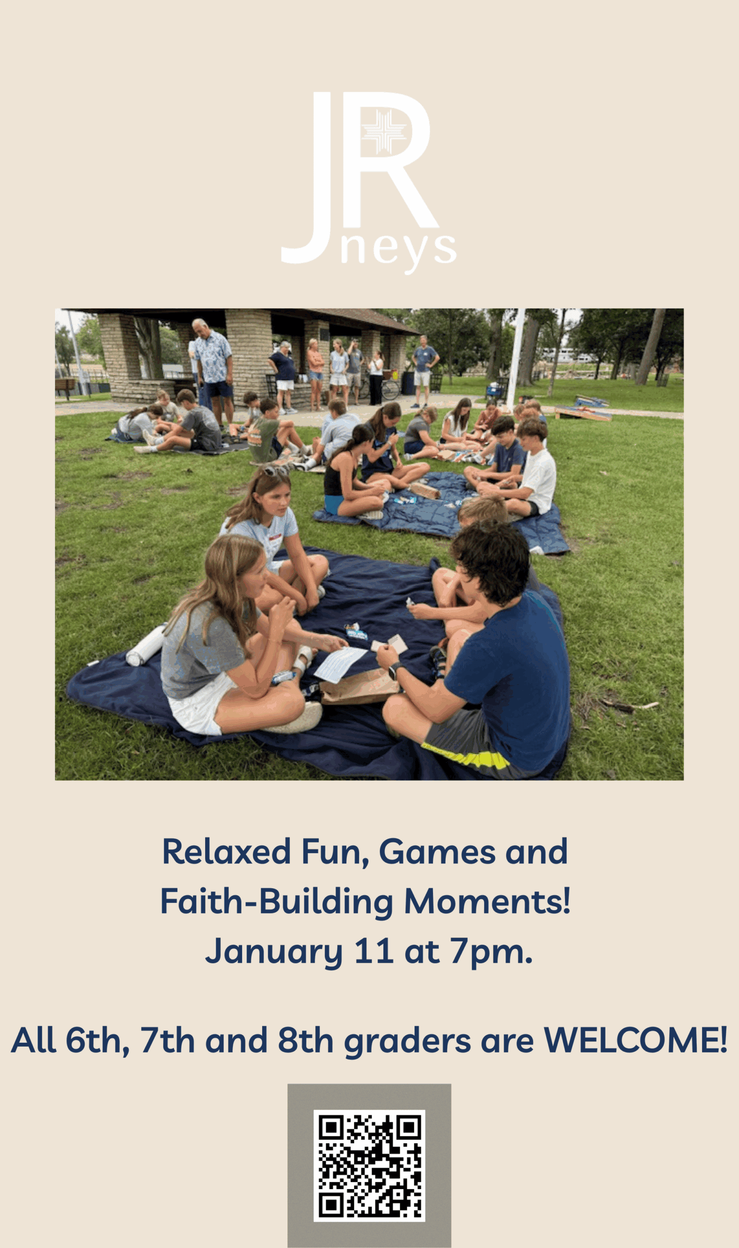 JRneys (pronounced “Journeys”) is our youth group for junior high students (6th-8th grade). Aiming to strike a balance between fun and faith, the meetings alternate between playing games and exploring how faith relates to the many issues facing teens today. JRneys is open to all who wish to attend and honor the code of conduct.