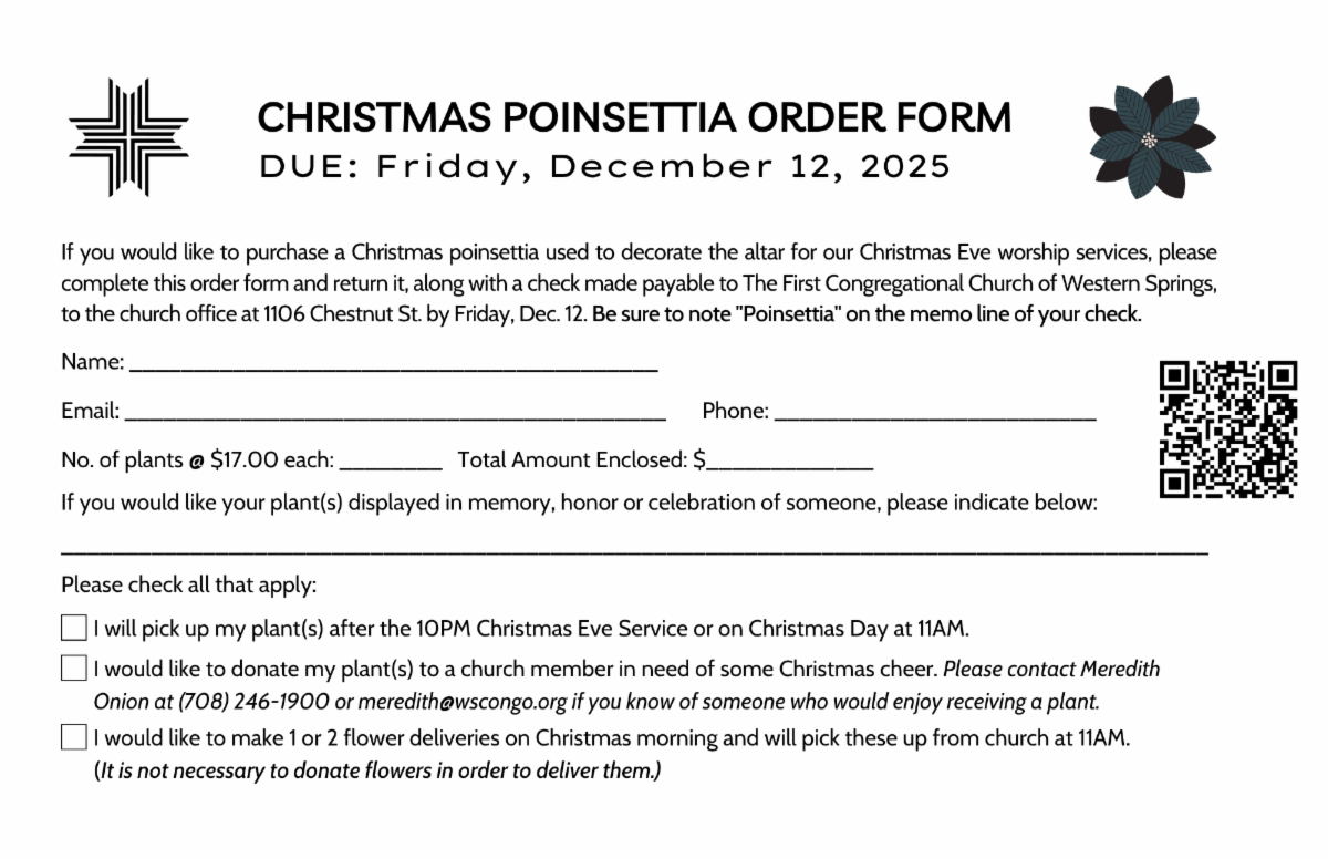 ![]() Who’s hungry? Girls Bite Out is coming in January! Ready for a night out that’s all about food, fun, and a little breathing room? Girls Bite Out is a new dinner group for First Congo women (and friends) who want to enjoy a good meal and great conversations. We’ll meet at a local restaurant about once a month from 6:30 pm to 8:00 pm starting in late January. Come when you can — no pressure and no prep. Interested? Reach out to Kathy Vega (kathleen@kbvega.com) or Lisa McTigue (lisa@wscongo.org) to be added to the Realm group. REACH OUT TO KATHY REACH OUT TO LISA ![]() PLAN AHEAD FOR END-OF-YEAR CONTRIBUTIONS! Pledge payments and other gifts intended for your 2025 tax statement (deductible in 2025) must be: Received in the church office by 9 AM on Tuesday, December 30 Dated December 31, 2025 or earlier These payments will be deposited into our bank account at noon on December 31. Please note that the church office is closed on December 31, although checks arriving by mail on December 31 will be opened and deposited. Payments through Realm will be recorded on the date of the transaction (which may be several days later than the date of your Realm submission). Please make your gifts through Realm by December 26 if possible. Contributions of securities will be dated on the day the stock is sold by our transfer agent (not the date you request the transfer), so please plan ahead! This process often takes a several days or more. For all 2025 and 2026 pledge payments and other gifts, kindly note the purpose of your payment on the memo line of the check or Realm transaction. Please contact Nancy O’Brien at 708-391-0448 (church phone), 708-927-2357 (cell or text) or nancy@wscongo.org for assistance with Realm payments or with any other questions. We are so grateful for your faithful and generous support of our ministries, programs and operations! REACH OUT TO FINANCE NANCY MAKE YOUR 2026 PLEDGE HERE ![]() |