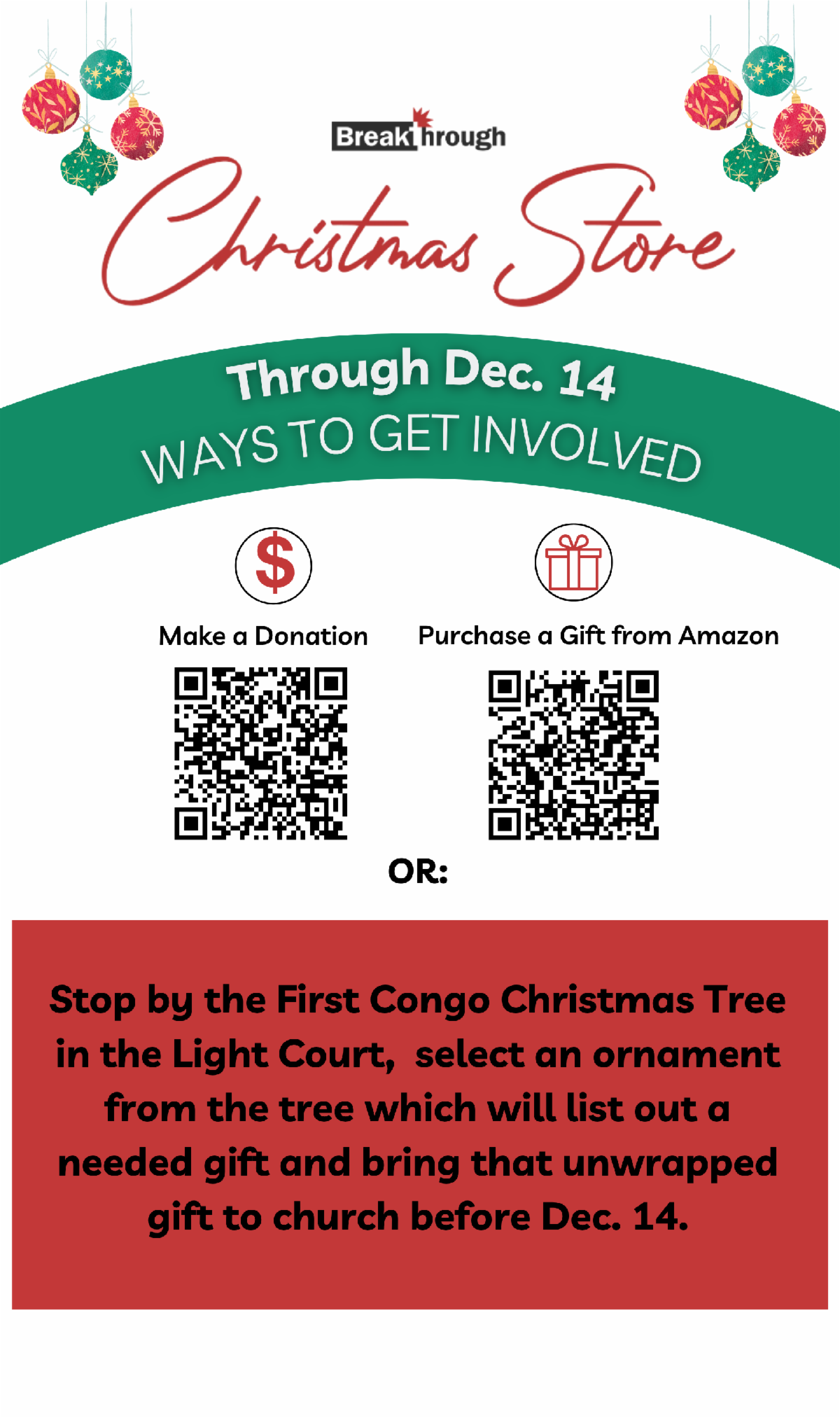 | Breakthrough Christmas GiftsIt is a cherished tradition at First Congo to support our mission partner, Breakthrough Urban Ministries, by providing Christmas gifts for the children served by their organization. Breakthrough partners with people to build connections, develop skills and open doors of opportunities in the East Garfield Park community. |
