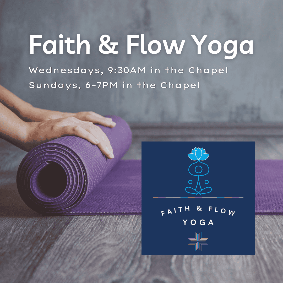 Join us for all-levels of Faith & Flow Yoga on Sunday evenings at 6:00PM and Wednesday mornings at 9:30AM in the Chapel. Students may also opt to practice virtually via Zoom on Sundays.