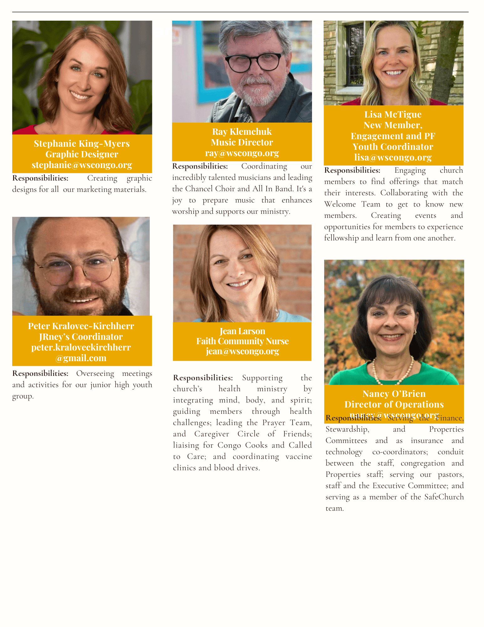 She serves as the Team Leader for Communications/Engagement/Office Management. She served as the lead staff liaison to the Strategic Vision Planning Team. She has co-facilitated a Caregiver Support Group and Grief Support Group. Meredith serves as a mentor to Members in Discernment in the UCC.