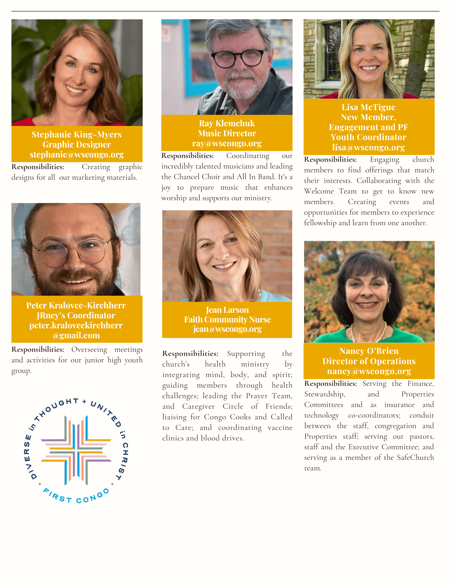 Meredith has been a member of First Congo since 1987. After 20 years of working in business, Meredith heard the call to ministry. She received her Masters of Divinity in 2013 from Loyola University Chicago, Institute of Pastoral Studies and was ordained in the United Church of Christ and installed as one of our Associate Ministers in 2014. Her ministry focuses on pastoral care, adult faith formation and small group leadership, including being the staff liaison to the Thursday Morning Woman’s Book Group, Seek.Pray.Love, Mission & Outreach, Justice and Inclusion Ministries, and the Diaconate.